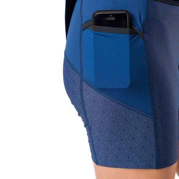 The Long Haul skirt offers up seven pockets with two designed specifically for hydration. The two hydration pockets are located on the back of the waistband and have elastic drawstrings to secure water bottles. Around the larger hydration pockets there are three smaller pockets to stash your nutrition. The final two pockets can be found on the outside of each thigh and offer plenty of room for your phone or even gloves/nutrition. These built-in compression shorts measure a 6” inseam, which makes this a “mid-length” skirt and a great option for anyone who wants a bit more chafe protection. A wide waistband and firm, elastic drawstring makes for a comfortable fit around the hips while also keeping the skirt in place when the pockets are full.