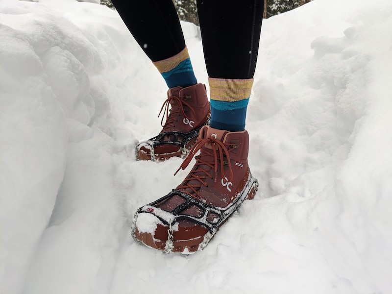 The On Running Cloudrocks bring together the best parts of running shoes and hiking boots to provide a comfortable, versatile shoe that offers up just enough support and protection. They do this by using a footbed that feels like your favorite trail running shoe, then adding an upper that is flexible yet durable. The “high-top” cut of the Cloudrock provides additional support around your ankles which is especially helpful if you’re on more technical trails with obstacles hidden in the snow. The shoe is well padded [but not quite insulated] with a sturdy outer/upper. These are essential features if you plan to wear these shoes with traction or snowshoes as they allow you to securely strap either to your feet. The Cloudrocks are also waterproof, yet somewhat breathable.