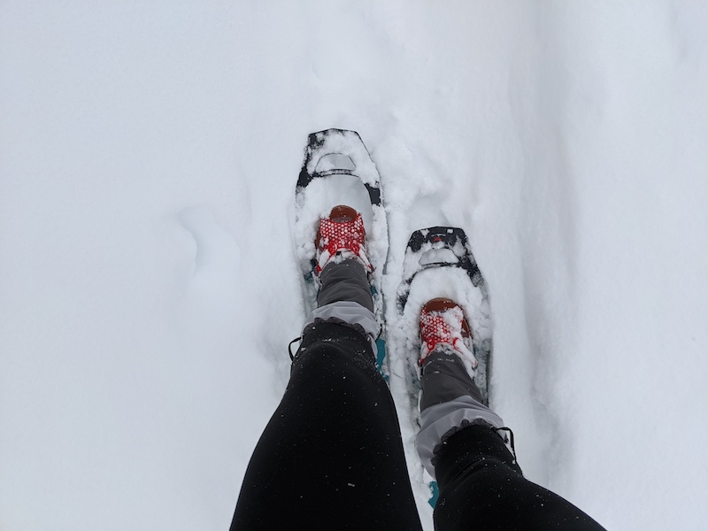 The MSR Revo Ascent Women’s snowshoe is lightweight, comfortable on various styles of footwear and great at maintaining traction on multiple trail surfaces. This is a composite frame snowshoe with steel teeth along each side and a steel crampon under each binding. The teeth along the bottom of the snowshoe are there to provide extra traction with each step. As you become more comfortable on snowshoes you’ll quickly notice where to place your weight for the most traction — valuable information to have! The women’s version of the Revo Ascent is a bit slimmer in size which allows you to walk a bit more than you waddle [we all channel our inner duck when snowshoeing, right!?]. This was immediately noticeable when I finished my adventures without snowshoe scuffs on my pants or gaiters — my snowshoes weren’t hitting my legs when I hiked!